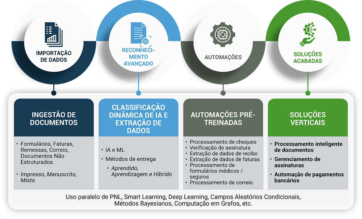 A Parascript aproveita um conjunto robusto de tecnologias de inteligência artificial para impulsionar recursos avançados de processamento de documentos. Os principais componentes incluem Smart Learning, que otimiza o desempenho por meio do aprendizado adaptativo, e Natural Language Processing (NLP) para entender entradas de texto complexas. Técnicas de aprendizado profundo, como Redes Neurais Convolucionais (CNN), Redes Neurais Recorrentes (RNN) e Redes Neurais Siamesas, permitem o reconhecimento de alta precisão de diversos formatos de dados. Metodologias adicionais, incluindo campos aleatórios condicionais, métodos bayesianos e cálculos baseados em gráficos, aprimoram ainda mais a capacidade do sistema de analisar e processar fluxos de trabalho de documentos complexos. Essa estrutura abrangente de IA garante alta precisão e eficiência em várias tarefas de processamento de documentos.