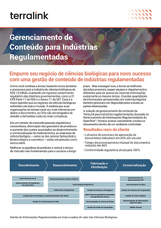 A solução de gerenciamento de conteúdo da TerraLink para indústrias regulamentadas, que é baseada no OpenText™ Regulated Information Management, fornece acesso conveniente a todos os documentos dentro de um ambiente controlado.
