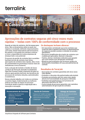 A solução de Gestão de Contratos e Casos Jurídicos da TerraLink, baseada na plataforma OpenText™ Contract Center, reúne automação, conformidade e maior eficiência em um único banner. Elimina que os contratos sejam armazenados em diferentes formatos, sistemas e departamentos. Ele coloca suas necessidades de negócios no centro do gerenciamento de seus contratos, introduzindo automação, agilizando as aprovações e garantindo a conformidade em todos os momentos. No entanto, isso é apenas o começo.
