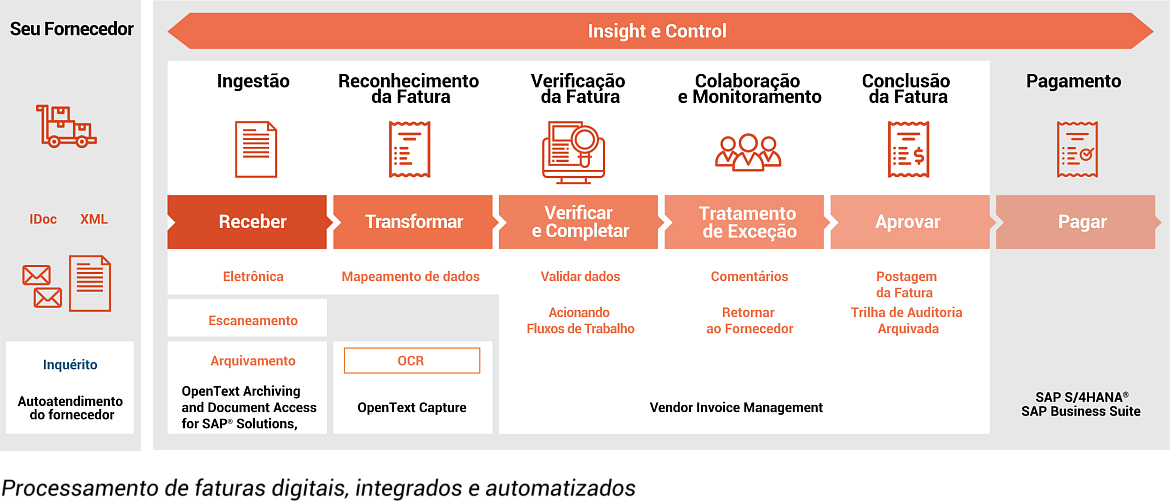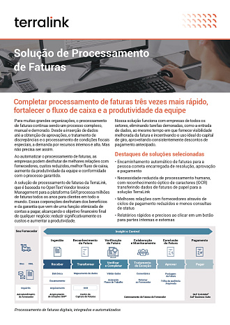 A solução Processamento de Faturas da TerraLink, baseada nas soluções OpenText™ Vendor Invoice Management for SAP® Solutions,instala um sistema baseado em regras no centro de suas operações de contas a pagar. Ele se concentra em otimizar seus processos internos primeiro, com ações pré-definidas ocorrendo sempre que uma fatura é adicionada ao sistema – roteando automaticamente a fatura para aprovação ou resolução, dependendo de todos os detalhes necessários serem fornecidos.