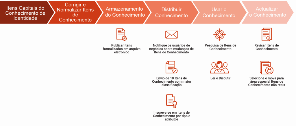 O diagrama acima mostra o processo de Gestão do Conhecimento. Ele começa com a identificação de um item de conhecimento, antes de corrigi-lo e formalizá-lo em uma visão padrão. Em seguida, decidimos qual local é o melhor para armazenar esse conhecimento para garantir que todas as pessoas engajadas possam vê-lo. Isso, no entanto, gera outro problema na Gestão do Conhecimento: como notificar os usuários de negócios corretamente e como dizer coisas como “Atenção a este documento, é muito importante!” ou “Este documento também é importante, mas nada de especial”.