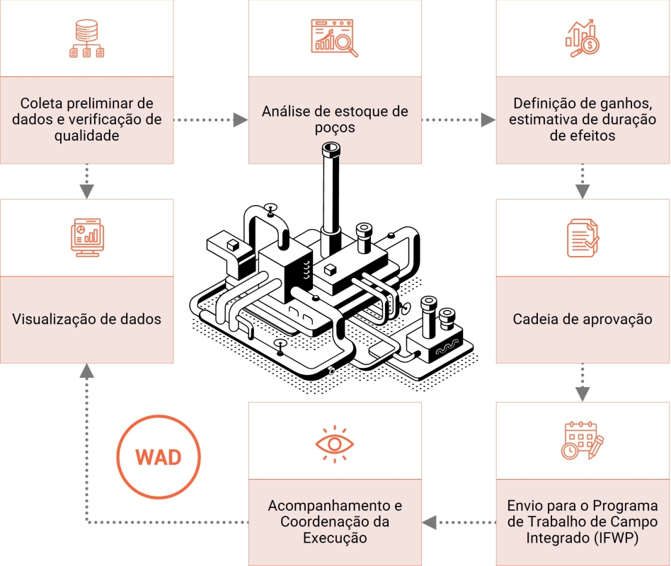 Como resultado, gera um conjunto de atividades de campo recomendadas que visam a melhoria do desempenho do poço e o aumento da produção.