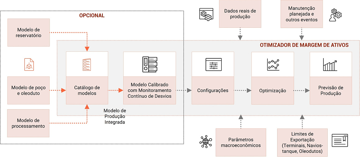 A integração de IA e ML na otimização operacional melhora a tomada de decisões e a maximização da margem. Um algoritmo de ML especializado processa uma matriz de dados operacionais de várias fontes, com foco na melhoria da lucratividade. A modelagem e o processamento de IA aproveitam os dados estatísticos em uma biblioteca de fluxo de trabalho para dar suporte à simulação, previsão de produção e planejamento de manutenção e reconstrução. Os cálculos de dados históricos incorporam parâmetros como horizonte de tempo, fatores econômicos, limites físicos e restrições de produção, garantindo uma otimização precisa. Essa abordagem é selecionável para vários métodos de otimização, oferecendo flexibilidade com opções de modelagem estatística, baseada em IA, baseada em modelo principal ou híbrida.