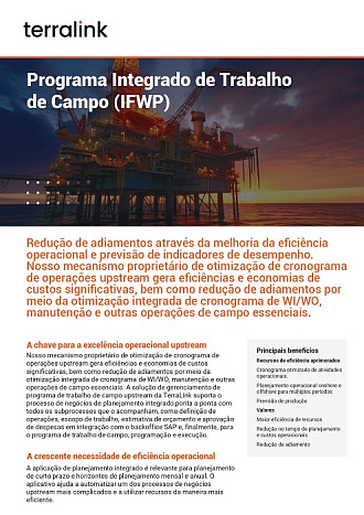 Nosso mecanismo proprietário de otimização do cronograma de operações upstream impulsiona a eficiência e a economia significativa de custos, bem como a redução de adiamentos por meio da otimização do cronograma integrado de WI/WO, manutenção e outras operações essenciais de campo. A solução de gerenciamento de programas de trabalho de campo upstream da TerraLink oferece suporte ao processo de negócios de planejamento integrado de ponta a ponta com todos os subprocessos de TI que o acompanham, como definição de operações, escopo de trabalho, estimativa de orçamento e aprovação de despesas em integração com o back office SAP e, finalmente, programação e execução do programa de trabalho de campo.